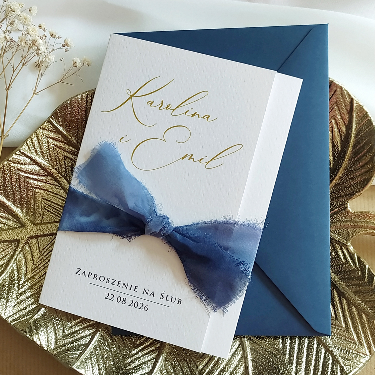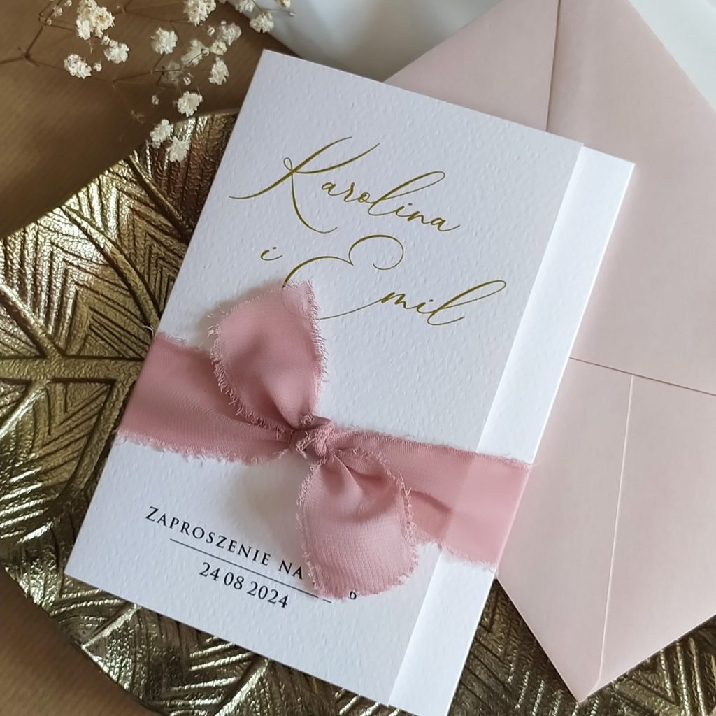 Zaproszenia ślubne w stylu minimalistycznym z elegancką rwaną wstążką. Dużym atutem jest tu użyty papier ozdobny ze strukturą filcu.