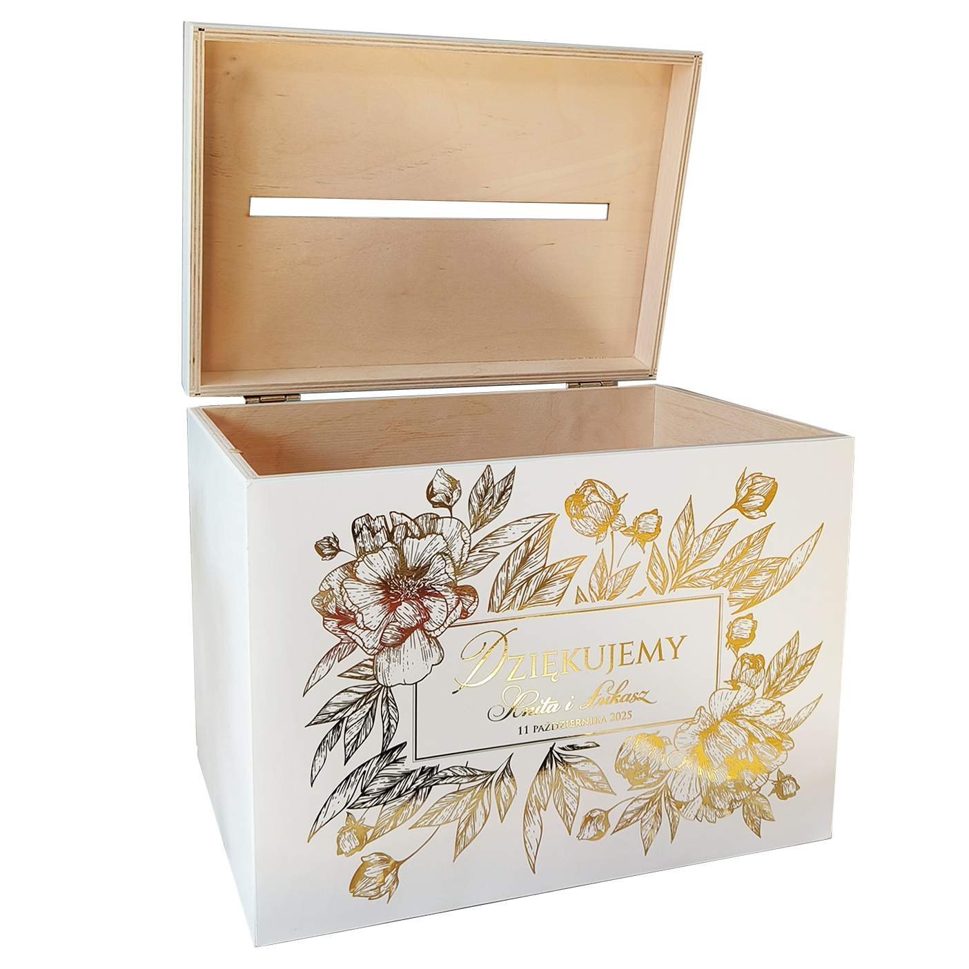 Solidne drewniane pudełko na koperty ślubne, malowane na biało. Na froncie pudełka złocona grafika kwiatowa z personalizowanym nadrukiem (etykieta pokryta ochronno-dekoracyjną folią soft-touch)