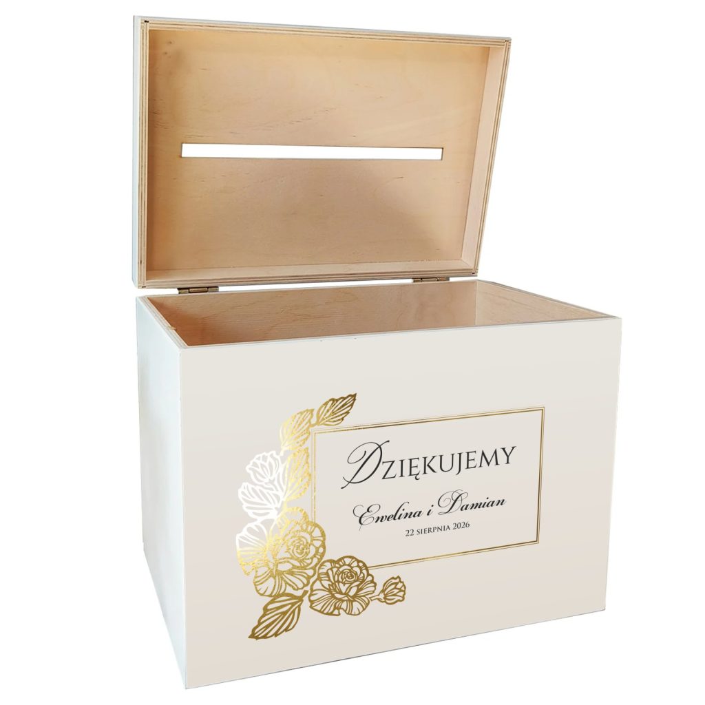 Solidne drewniane pudełko na koperty ślubne, malowane na biało. Na froncie pudełka złocona grafika kwiatowa z personalizowanym nadrukiem (etykieta pokryta ochronno-dekoracyjną folią soft-touch)