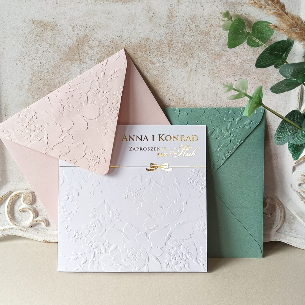 • kwadratowe zaproszenie z tłoczeniem i złoceniem na froncie i wewnątrz