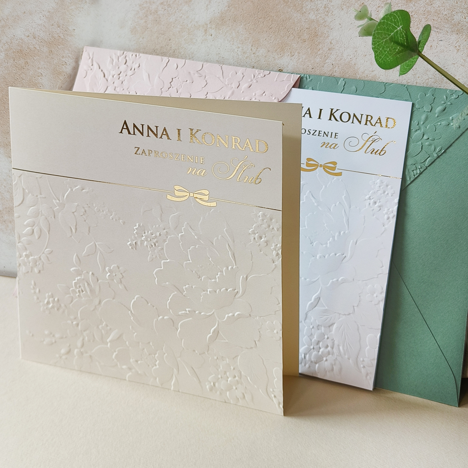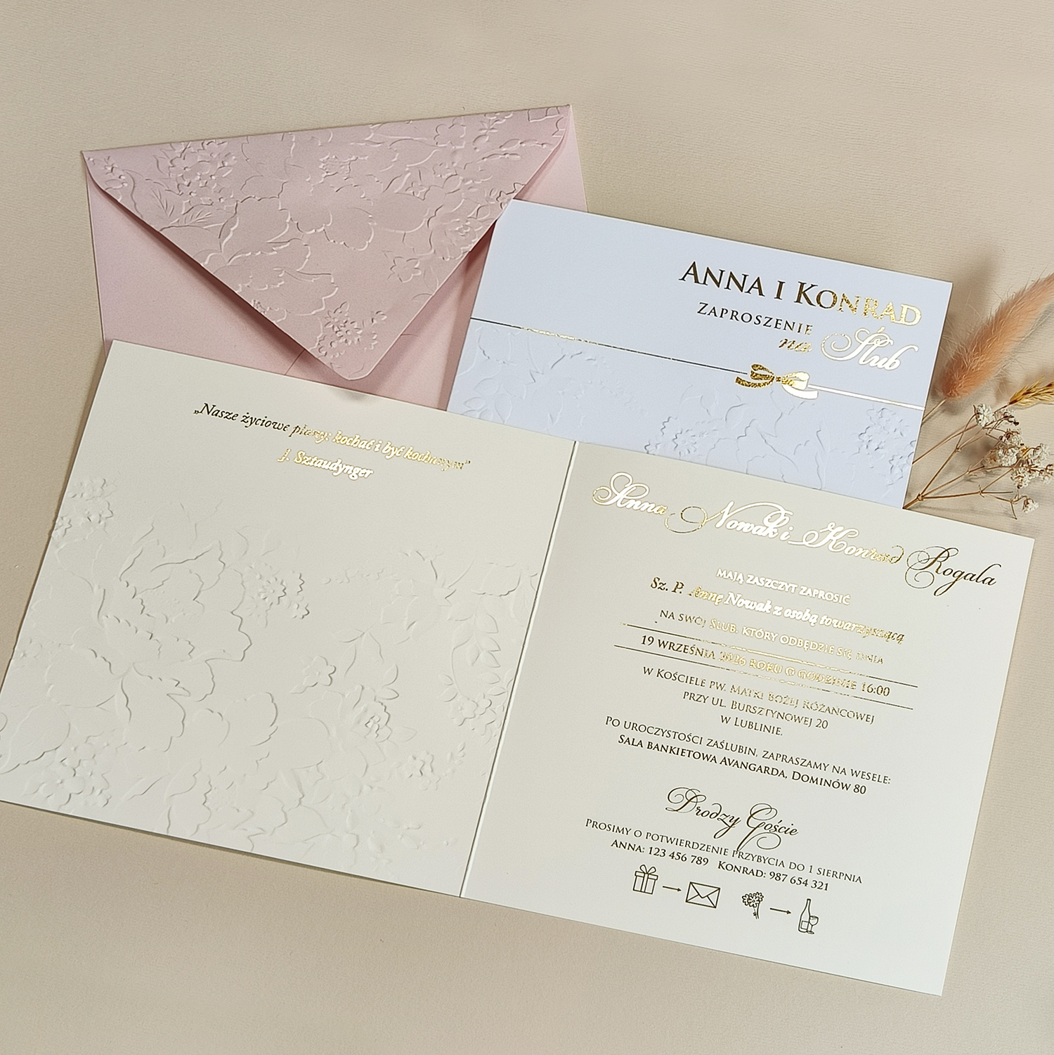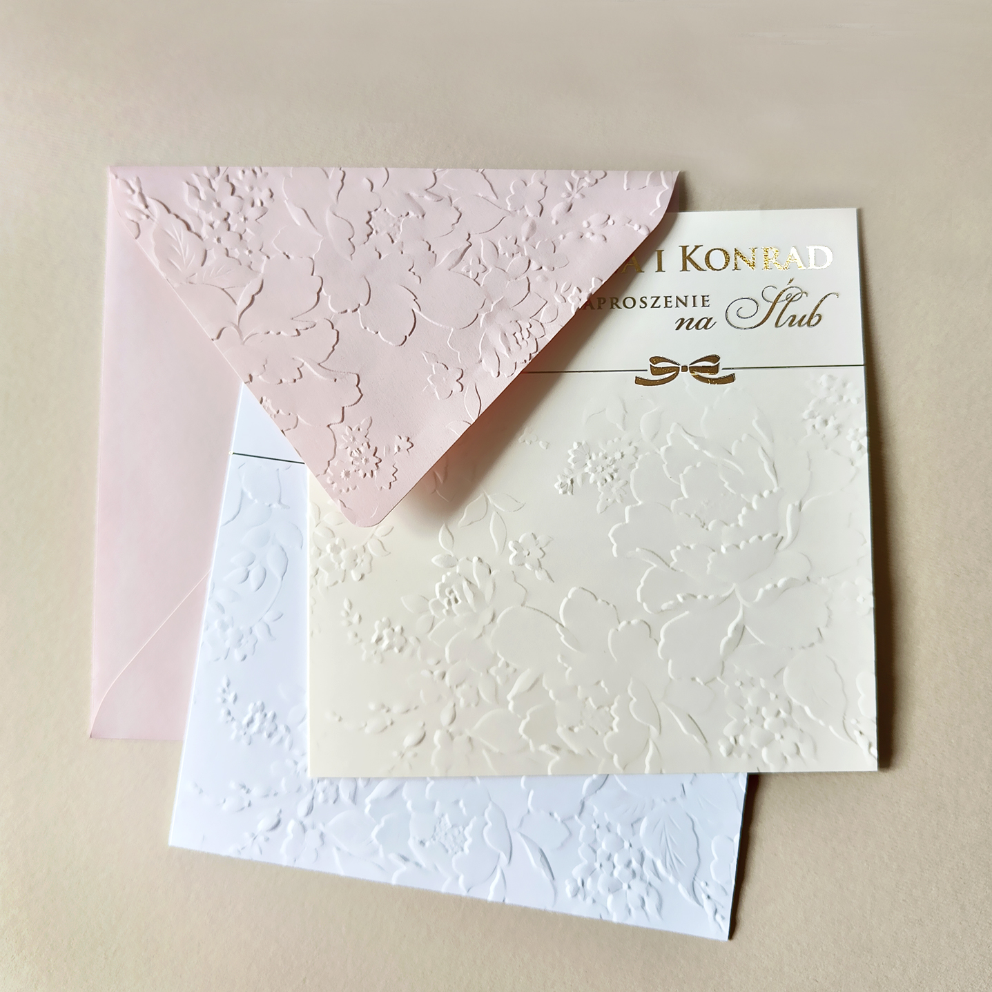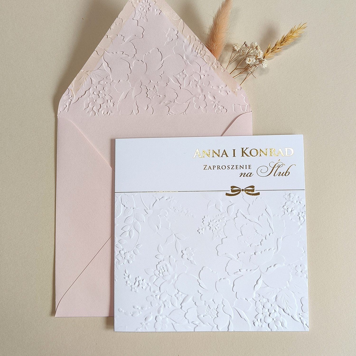 • kwadratowe zaproszenie z tłoczeniem i złoceniem na froncie i wewnątrz